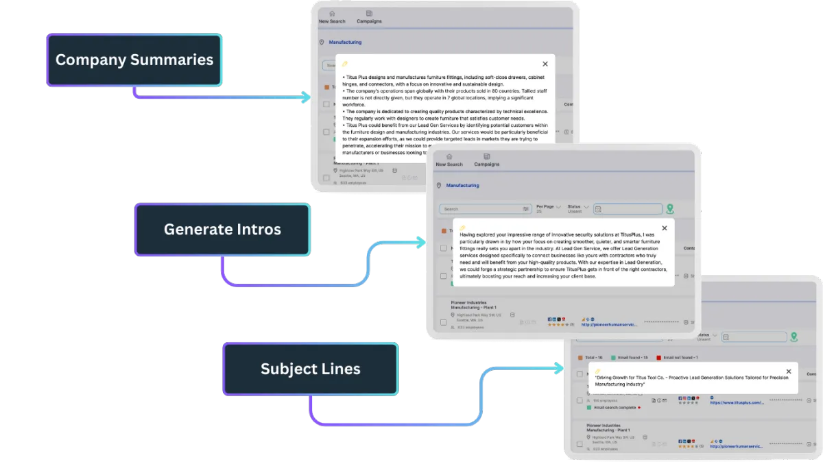 Generate company summaries in a click to know exactly what your prospect is about and how you can help their company.